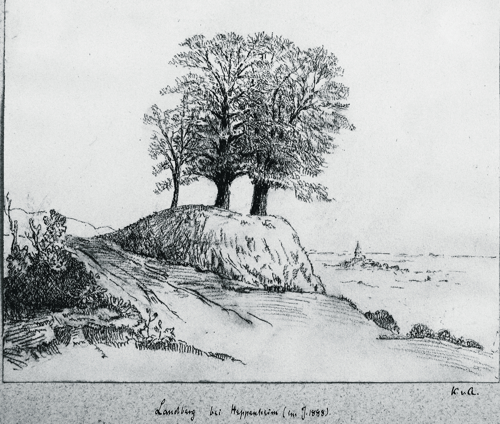 Der Landberg bei Heppenheim, Sitz des Centgerichts Starkenburg, gezeichnet von Karl von Amira 1888 (rechtsarchäologische Sammlung Karls von Amira, Leopold-Wenger-Institut München, Mappe 22 a)