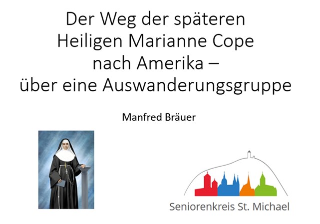 Im Januar 2025 ist die „Heilige Marianne Cope“ ein Thema in Heppenheim: Der Pastoralraum „Pfarrei Heilige Marianne Cope“ wird gegründet. Zu diesem Pastoralraum gehört auch die Pfarrei St. Michael in Hambach. Der dortige Seniorenkreis hatte Manfred Bräuer zu einem Vortrag zu Beginn des neuen Jahres über die Auswanderungsgruppe, die 1839 Heppenheim und die umliegenden Dörfer verlies, eingeladen.