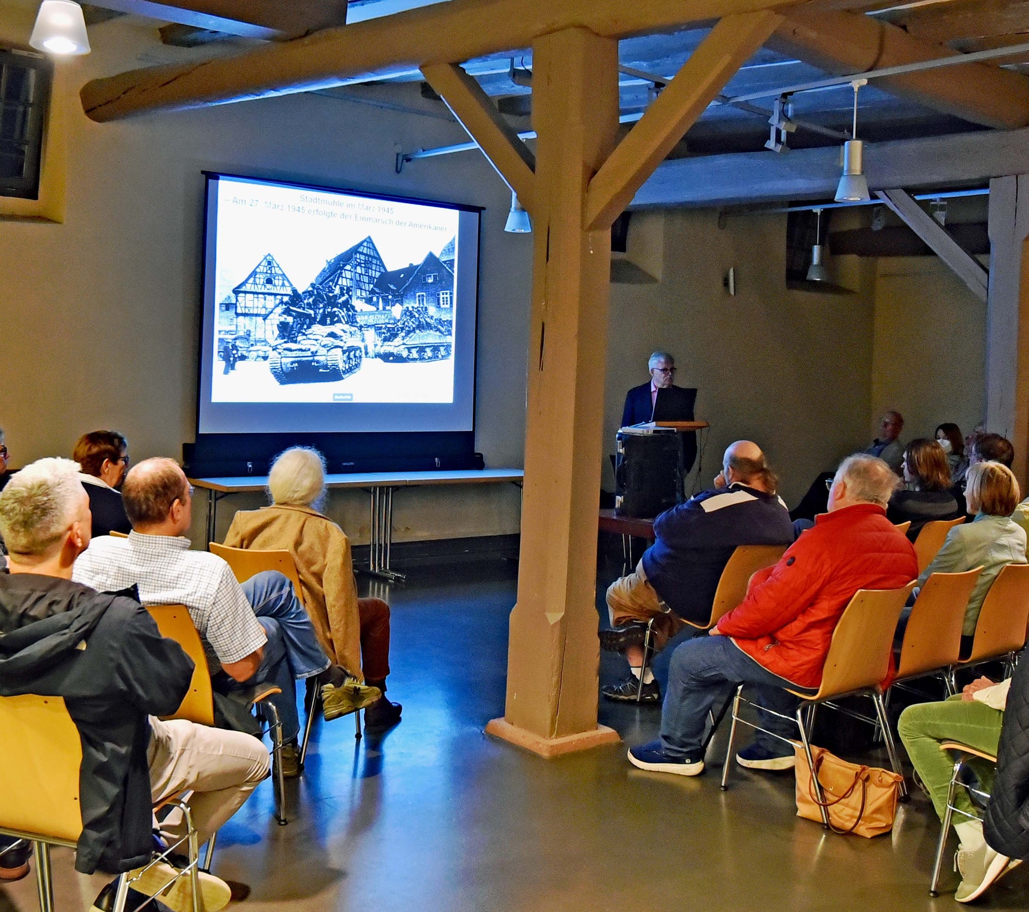 In einem gut besuchten, vom Geschichtsverein organisierten Vortrag am 15. Oktober 2025, im Heppenheimer Marstall berichtete Dr. Müller ausgiebig über seine Forschungsarbeit. Neben neuen Erkenntnissen über viele Mühlen, z. B. der Brandstiftung in der Götzingersmühle 1851 durch den Mühlenbesitzer, standen die Müller als Menschen mit ihrem gar nicht romantischen, sondern sehr harten Leben im Blickpunkt. Ein Beispiel war die große Not des Müllers Lorenz Flath I. nach der erzwungenen Stilllegung seiner Mühle. Anhand neu gefundener Fotos, Plänen, Aktenauszügen und neuen Fragestellungen gab Dr. Müller einen Einblick in die vielfältigen Aspekte der Mühlengeschichte, in der auch die Mühlesel und die Farbe müllerblau nicht unberücksichtigt blieben. Abschließend bat der Vortragende um weitere Unterstützung bei der Suche nach neuen Informationen. Seine Spurensuche geht weiter und es gibt noch viele Fragen zu klären.