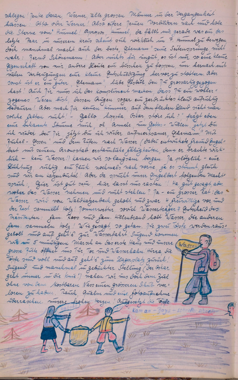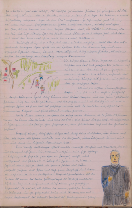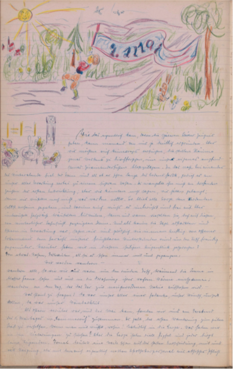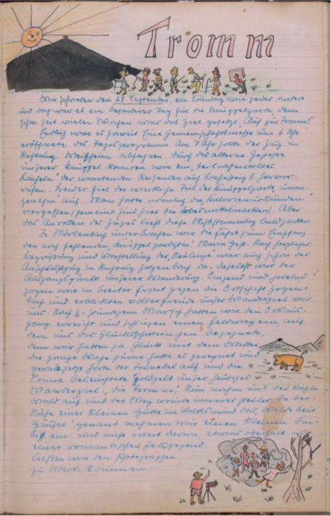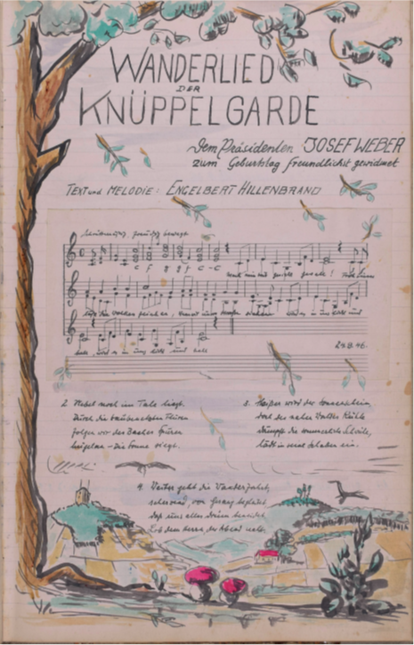 Direkt am nächsten Tag setzte ich mich ans Telefon und kontaktierte Frau Hillenbrand im Schokoladengeschäft, die mir den direkten Kontakt zu ihrem Mann R. Hillenbrand, einem Sohn von Engelbert Hillenbrand, vermittelte. Bei unserem ersten Telefonat war Herr Hillenbrand zugleich erschrocken und erfreut, da das Buch seit 2020 verschollen war und kläglich vermisst wurde. Wie ich mir schon lange dachte, sollte dieses wundervolle Stück Familiengeschichte nie verkauft werden und war nur irrtümlich einer Entrümpelung „zum Opfer gefallen“. Herr Hillenbrand bot mir direkt seine Unterstützung bei der Transkription sowie allen weiteren Vorhaben an. Bei einem ersten persönlichen Treffen bei mir zuhause konnten wir feststellen, dass wir beide die Faszination für das Buch teilen und der Meinung waren, dass dieses Werk der Kameradschaftlichkeit, Freude und Zuversicht in die damalige Zukunft nach dem zweiten Weltkrieg nicht in Vergessenheit geraten sollte. Im Anschluss verbrachten mein Mann und ich die kalten Abendstunden des Novembers damit, in die Welt der Knüppelgarde einzutauchen und dem Wanderbuch alle Geheimnisse zu entlocken.Herr Hillenbrand stimmte zu, dass Frau Rehbein eine Digitalisierung des Buchs durchführen durfte, um neben den transkribierten Texten auch die originalen handschriftlichen Berichte und kolorierten Zeichnungen darstellen und künftig für jedermann nacherlebbar machen zu können.