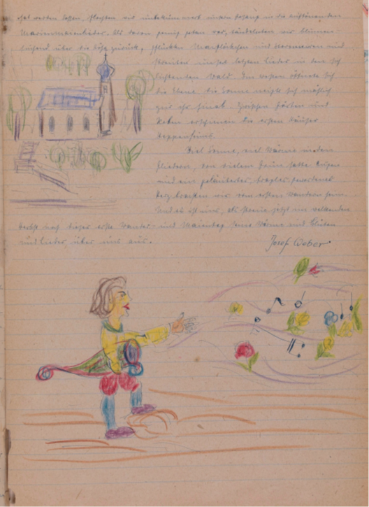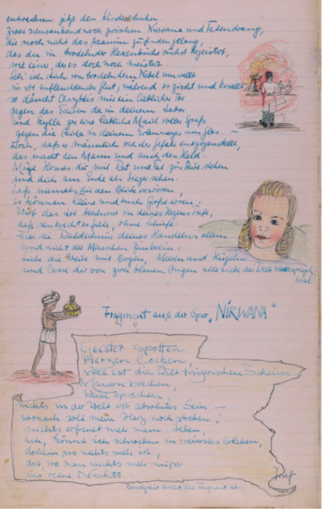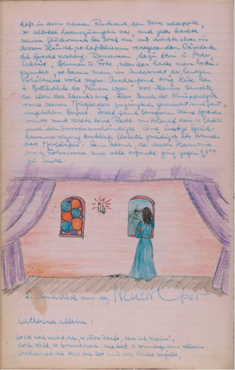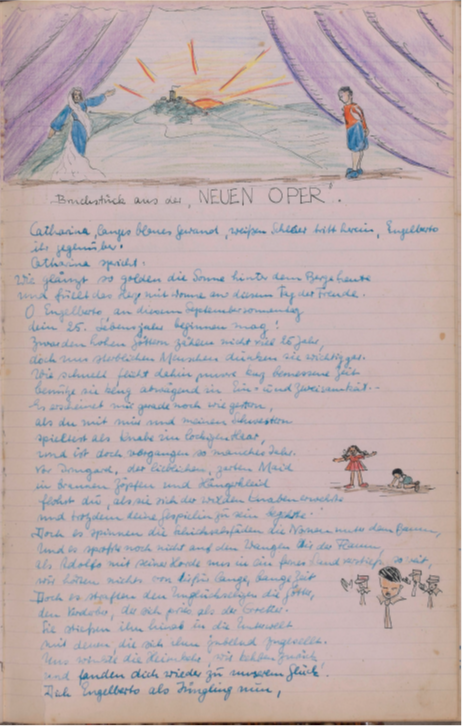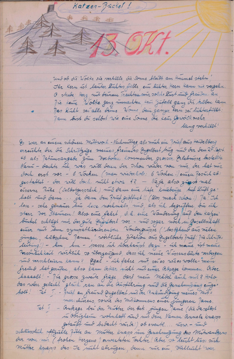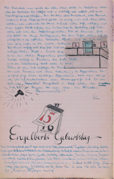 Am Sonntagabend, den 15. Sept. wurde in der Villa „Hammerruh“ Engelberts Geburtstag feierlich begangen. Unter dem herbstlich bunten Dahlienstraß von Josef für seinen Kommilitonen von Tante Kättche erbeten, lagen Zigarren, Zigaretten, Streichhölzer, Aschenbecher, Trauben, Dibionta, Trachitol, Kunstbrief. Auf dem festlich gedeckten Tisch lockten lukullische Genüsse wie belegte Brötchen, schwarzer Tee, Weincreme u. Wein zum Festtagsschmaus ein. Es blieb nicht übrig. Zum Vortrag gelangte ein Bruchstück aus der „Neuen Oper“ und eine Arie aus der neuen Oper „Nirvana“, letzte vorgetragen von Josef.Bruchstück aus der Neuen Oper