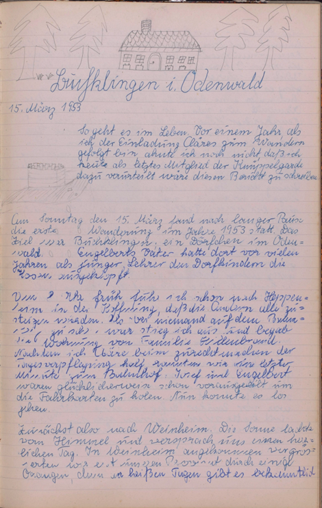 Am Sonntag, den 15. März fand nach langer Pause die erste Wanderung im Jahre 1953 statt. Das Ziel Buchklingen; ein Dörfchen im Odenwald. Engelberts Vater hatte dort vor vielen Jahren als junger Lehrer den Dorfkindern die Hosen ausgeklopft.