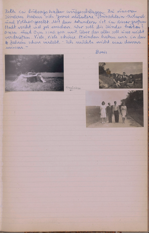 Bald war die große Irrfahrt durch die temperamentvolle Herta geschildert, der bestellte Kuchen verzehrt u. Bier, Limonade u. Milch getrunken, als der bis dahin noch amtierende Präsident Engelbert die Wahlkommission zur Auswertung der übersandten Wahlzettel bestimmte. Die Wahl fiel auf: Herta und Oskar. In straffer Haltung, eingedenk der großen Aufgabe und der großen Stunde, zogen sich die Genannten an einen runden Ecktisch zurück und walteten voll Eifer ihres verantwortungsvollen Amtes! Nach ¼ stündiger Arbeit konnte das Ergebnis bekanntgegeben werden. Neuer Präsident: Elsbeth Klotz mit 7 Stimmen! Wanderführer: Renate Schilling mit 5 Stimmen! Eine Stimme war ungültig! Unsere allerherzlichste Gratulation für beide! Möge ihre zukünftige Arbeit mit Erfolg gekrönt werden! Weiter wurde noch unsere liebe Cläre gleich mit Stimmenmehrheit mit 2 Ämtern: Verpflegung und Kasse betraut. Auch Engelbert wird uns weiterhin seine große Geistes- und Schaffenskraft als neugewählter Schriftführer schenken. Ebenso der unermüdliche Werner als alter und neuer Photokünstler! Allen gewählten Freunden ein frohes: Glückauf! Zu neuer, fruchtbringender Arbeit. Nachdem die Wahlzeremonie beendet, wurde die weitere Tagesroute festgelegt und dann ging es weiter in blendender Stimmung der Wegscheide entgegen. Singend u. wettfahrend kamen wir um 12 h dort an und erkundigten uns nach einem lieben Fleckchen Erde, auf dem wir lagern und abkochen konnten. Wir erhielten gute Auskunft, fuhren nach den uns gegebenen Angaben einen Waldweg (für die Damenwelt „Halsbrecherisch“!) hinunter u. landeten nach 10 Minuten im schönsten Wiesen- u. Waldtal! Wasser, Steine, Kühe, Heidelbeeren, Wiese, Holz u. sogar später (durch Engelbert u. Oskar herausgeholt) Milch gab es in rauen Mengen! Alles in allem: ein idealer Lagerplatz! Es wurde nun Wasser geschöpft, Feuerstelle bereitet, gekocht, Erdbeeren gepflückt und den beiden Kleinen in paradiesischer Nacktheit freien Lauf gelassen. Und dann kam das Mittagessen! Donnerwetter! Ein Essen war das! Ganz große Klasse, mit einer Wurst ohne Schwindsucht! Aber es wurde gegessen u. Ehre wem Ehre gebührt, alles aß bis zum letzten Schlag der wohlschmeckenden: Bohnen- Ei und Erbsenwurstsuppe! Hoho – und es kam noch besser! Pudding gab’s auch noch! Schokoladen- und Vanille-Pudding! Aber dann kam der Schlusspunkt Es ging nicht mehr! Und der Schlaf verlangte nun seine Opfer! Um 17 h aber bies das Heimweh zum allgemeinen Aufbruch! Nachdem nun noch die gepflückten Heidelbeeren verdrückt, Männlein u. Weiblein frisiert und gewaschen, das ganze Inventar verpackt war, ging es mit einer netten, scheuen Wehmut dem Wegscheidepunkt wieder zu. In einer Schussfahrt in die Ebene ließen wir noch einmal den ganzen Zauber herrlicher Landschaften, lieblicher