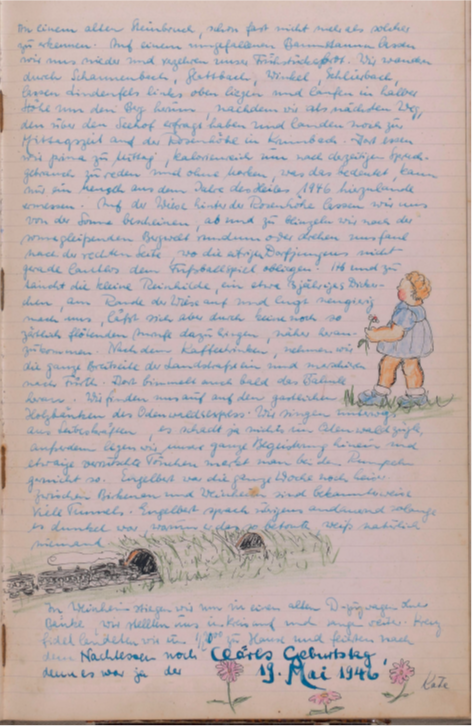 In Weinheim steigen wir nun in einen alten D-Zugwagen ohne Bänke, wir stellten uns im Kreis auf und sangen weiter. Kreuzfidel landeten wir um ½ 2000 zu Hause und feierten nach dem Nachtessen noch Cläres Geburtstag, denn es war ja 19. Mai 1946.