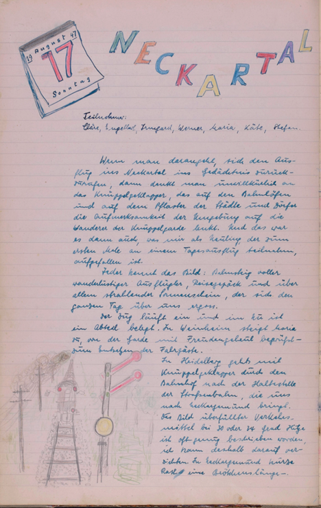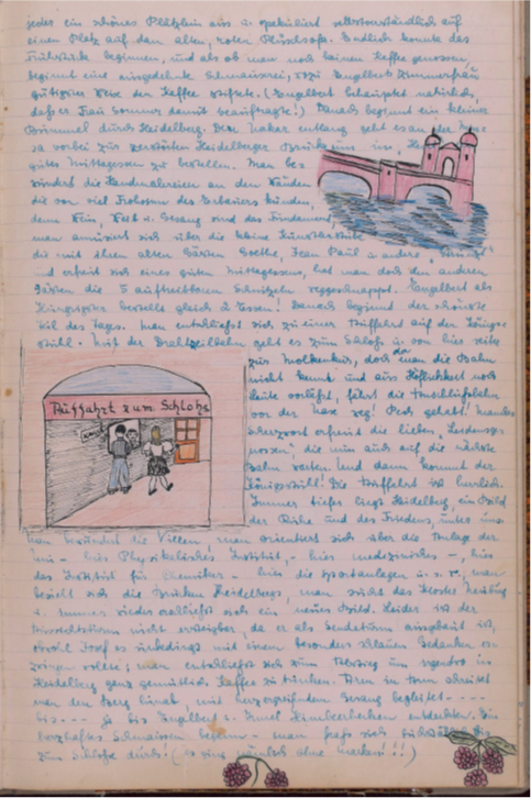 ½ 6 in der Frühe. Die Sonne kitzelt einigen müden Schläfern ganz vergnügt in das Gesicht und erinnert sie daran, dass heute die lang geplante Tour nach Heidelberg steigt. Habt ihr sie aus den Betten steigen sehen? Nach gemeinschaftlichem Gottesdienste machen sich die Knüppelgardianer Irmgard, Engelbert und Cläre mit einem zünftigen Wanderstabe bewaffnet auf den Weg zur Bahn. Schwesterlein Käte schaut ihnen betrübt nach, denn eine Halsentzündung fesselt sie ans Bett. Mit viel Scherzen beginnt die Fahrt. Doch was haben denn die 3 Gesellen in Weinheim vor? Es ist doch noch nicht das Ziel? Man hört die Frage: „Wo wird sie stehen?“ Und nun beginnt gar ein kleiner Disput: „Unter der Uhr hat sie gesagt u. dabei ist doch gar keine mehr da!“ Wer mag Recht haben? --- W – e – i – n – h – e – i – m! --- Und da: „Da ist doch ne Uhr!“ „Hallo - - - Maria!“ Also wird jemand dazu kommen! Unser Hesslein erscheint auf der Bildfläche. Armer Engelbert, 3 Mädchen – 1 Mann! Es wird sicher ein schöner Tag werden. Die Fahrt geht weiter der Bergstraße entlang und bald ist das Ziel Heidelberg erreicht. Doch was mag die Garde jetzt beginnen?! Man steckt die Köpfe zusammen u. kichert man sucht den Bahnsteig ab und plötzlich ein Gejuchze. Was dies zu bedeuten hat? Ob es mit dem jungen Mann in der gelben Weste zusammenhängt? Doch man hat doch schon mehr Männer mit dunkler Hose u. heller Jacke gesehen, also kein ungewohntes Bild! Und dann strecken sich 4 Paar Hände dem jungen Mann mit großer Herzlichkeit entgegen. Josef hat das Klüblein vervollständigt; nun kann der Tag in Heidelberg beginnen. Man schlängelt sich durch den regen Betrieb am Bahnhof Heidelberg und sucht wie alles andere, Elektrische, Autos u. OEG – sein Weg durch das Getriebe und plötzlich liegt der Neckar vor ihnen. Da es leider zu einer Kahnfahrt nicht kommt geht die Knüppelgarde auf Engelberts Studentenbude. Nachdem man mit neugieren Augen das Zimmerlein betrachtet hat, sucht sich
