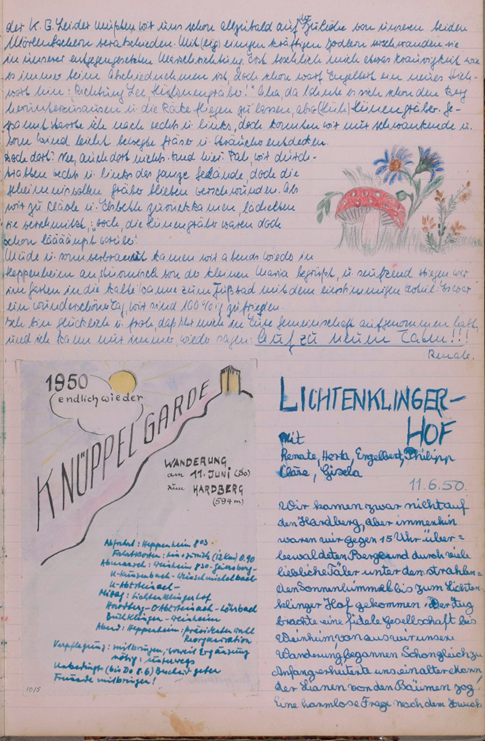 Zuhause angekommen durchstöberte ich mit wachsender Begeisterung das liebevoll gestaltete Vereinsbuch mit zahlreichen Wanderberichten aus der Nachkriegszeit. Mal heiter, mal nachdenklich und mal poetisch ausgeschmückt beschreiben darin die Mitglieder der „Garde“ ihre Erfahrungen während und zwischen den Wandertouren, die sie bis in das Jahr 1957 erlebten. Die Knüppelgarde, so stellte sich heraus, war ein in Heppenheim ansässiger Wanderverein aus jungen Leuten Anfang 20, die sich gerade in ihrem Studium oder der Ausbildung befanden und die gemeinsame Lust am Wandern teilten und die wiedergewonnene Freiheit nach dem Krieg genossen.