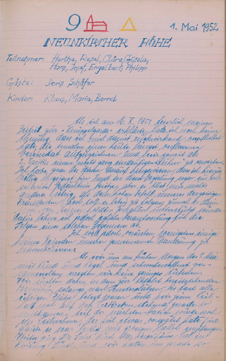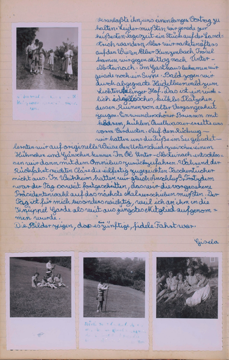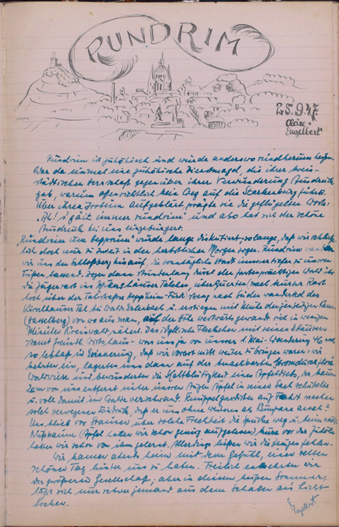 Um 600 fanden wir uns zum Gottesdienst ein, alle 6 und um ½ 800 starteten wir in Richtung Starkenburg. Mutti widmete uns noch einen wohlgefällige[n] Blick und fand das Aussehen der Garde zünftig. Wir, das Dreimädelhaus in rotbunten Dirndln den Brotbeutel umgehängt, unsere Partner in kurzen Hosen und Windjacken. Von Josefs kurzer Hose, die er übrigens bei Engelbert pumpte, erzählte er uns unterwegs folgendes nette Zwiegespräch mit seiner Tante Kättche. Also abends bringt er die gepumpte Hose nach Hause. Tante Kättche: „Aber die Hose wolle sie doch net aaziehe?“