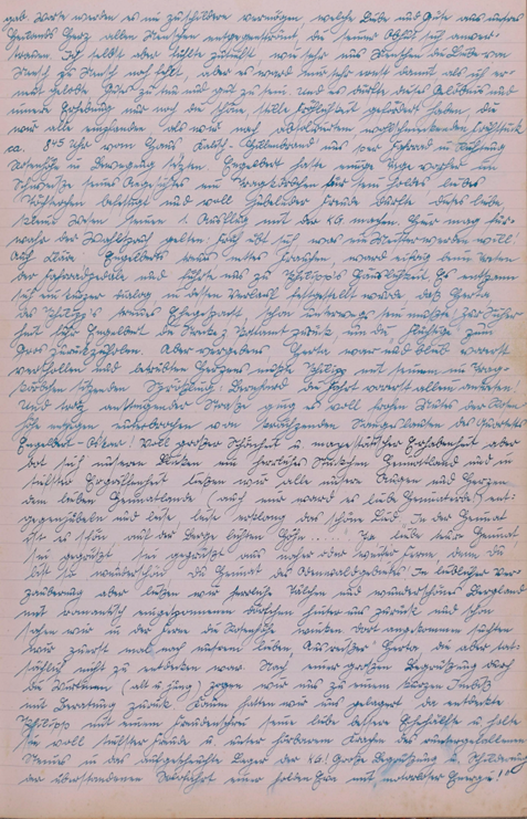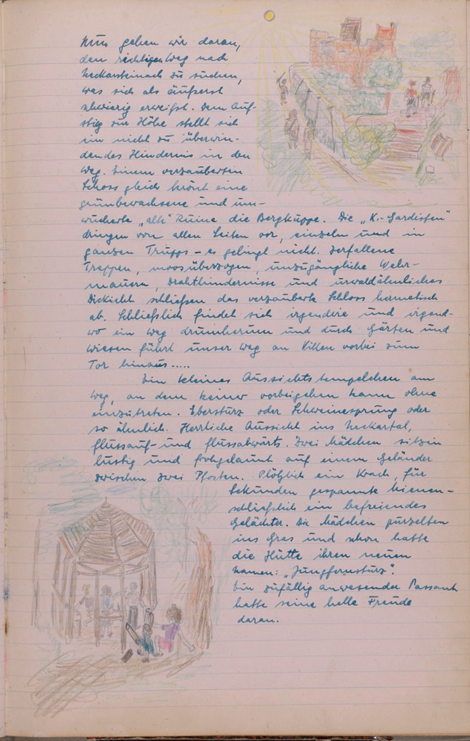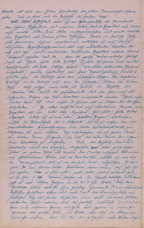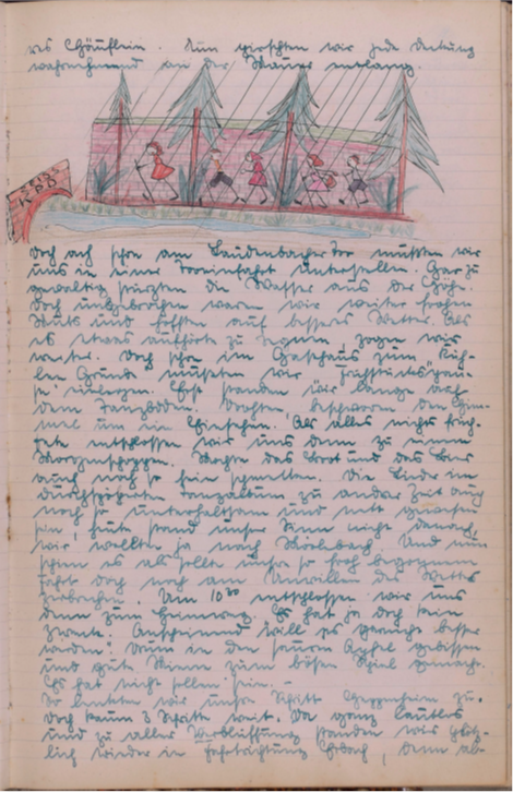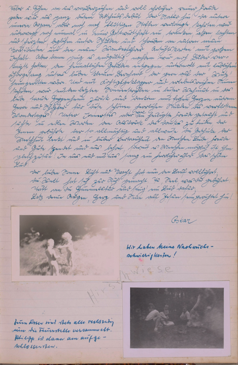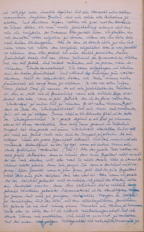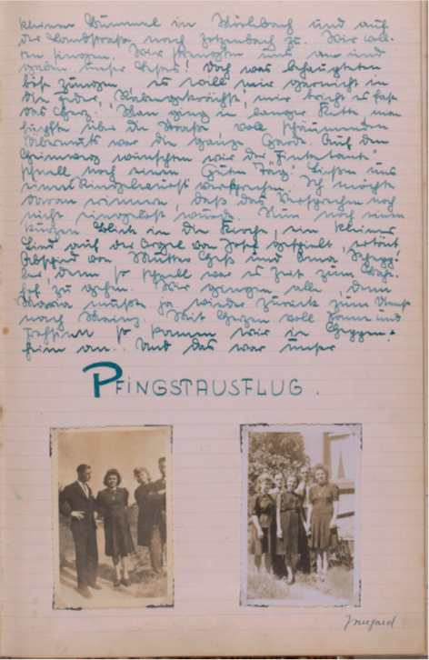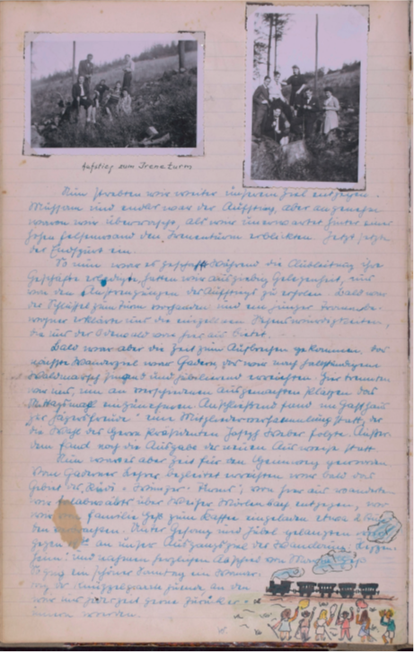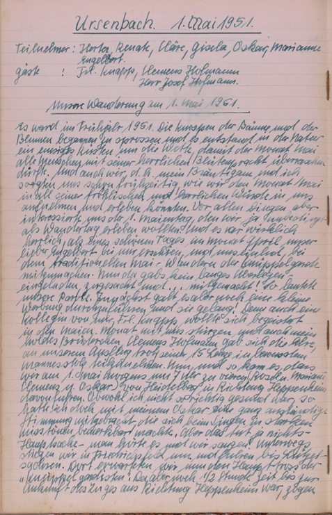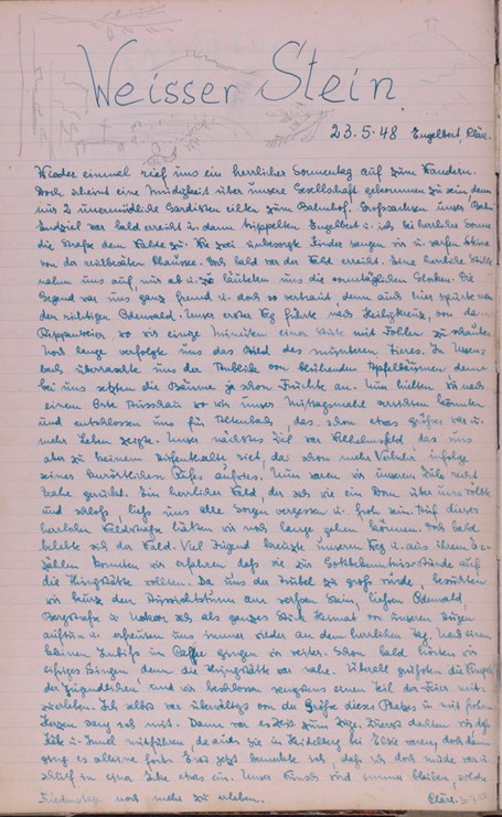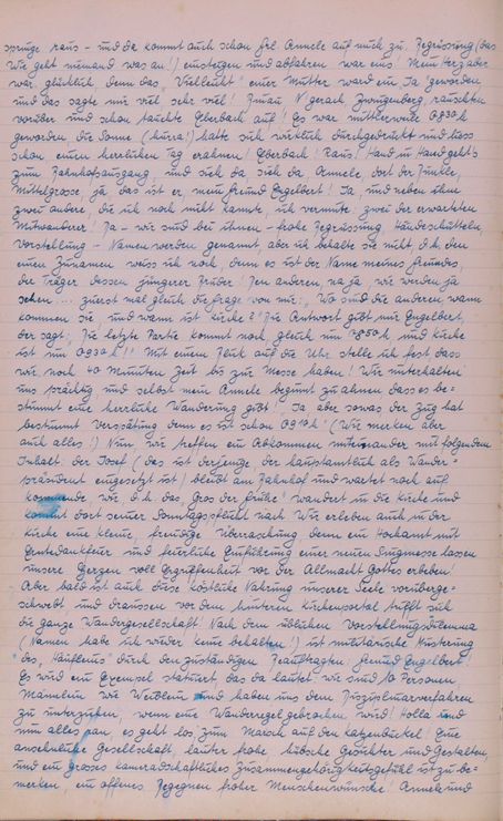 Wieder einmal rief uns ein herrlicher Sonnentag auf zum Wandern. Doch scheint eine Müdigkeit über unsere Gesellschaft gekommen zu sein, denn nur zwei unermüdliche Gardisten eilten zum Bahnhof. Großsachsen unser Bahn Endziel war bald erreicht u. dann trippelten Engelbert u. ich bei herrlicher Sonne die Straße dem Walde zu. Wie zwei unbesorgte Kinder sangen wir u. warfen Steine von der reich besäten Chaussee. Doch bald war der Wald erreicht. Eine herrliche Stille nahm uns auf u. nur ab und zu läuteten uns die sonntäglichen Glocken. Die Gegend war uns ganz fremd u. doch so vertraut, denn auch hier spürte man den richtigen Odenwald. Unser erster Weg führte nach Heiligkreuz, von da nach Rippenweiher, wo wir einige Minuten einer Stute mit Fohlen zuschauten. Noch lange verfolgte uns das Bild des munteren Tieres. In Ursenbach überraschte uns der Anblick von blühenden Apfelbäumen, denn bei uns setzten die Bäume ja schon Früchte an. Nun hielten wir nach einem Orte Ausschau wo wir unser Mittagsmahl verrichten könnten und entschlossen uns für Altenbach, dass schon etwas größer war u. mehr Leben zeigte. Unser nächstes Ziel war Wilhelmsfeld, das uns aber zu keinem Aufenthalte riet, das schon mehr Verkehr infolge seines kurörtlichen Rufes aufwies. Nun waren wir unserem Ziele recht nahe gerückt. Ein herrlicher Wald, der sich wie ein Dom über uns wölbte und schloss, ließ uns alle Sorgen vergessen u. froh sein. Auf dieser herrlichen Waldstraße hätten wir noch lange gehen können. Doch bald belebte sich der Wald. Viel Jugend kreuzte unseren Weg u. aus ihrem Erzählen konnten wir erfahren, dass sie zur Gottbekenntnis-stunde auf die Thingstätte wollten. Da uns der Jubel zu groß wurde, besuchten wir kurz den Aussichtsturm am weißen Stein, ließen Odenwald, Bergstraße u. Neckar sich als ganzes Stück Heimat vor unseren Augen auftun u. erfreuten uns immer wieder an dem herrlichen Tag. Nach einem kleinen Imbiss im Café gingen wir weiter. Schon bald hörten wir eifriges Singen, denn die Thingstätte war nahe. Überall grüßten die Wimpel die Jugendlichen und wir beschlossen wenigstens einen Teil der Feier mitzuerleben. Ich selbst war überwältigt von der Größe dieses Platzes u. mit frohem Herzen sang ich mit. Dann war es Zeit zum Zuge. Zuerst dachten wir, dass Käte u. Irmel mitführen, da auch sie in Heidelberg bei Elsie waren, doch dann ging es alleine fort. Erst jetzt bemerkte ich, dass ich doch müde war u. schlief in einer Ecke etwas ein. Unser Wunsch wird immer bleiben, solche Friedenstage noch mehr zu erleben.