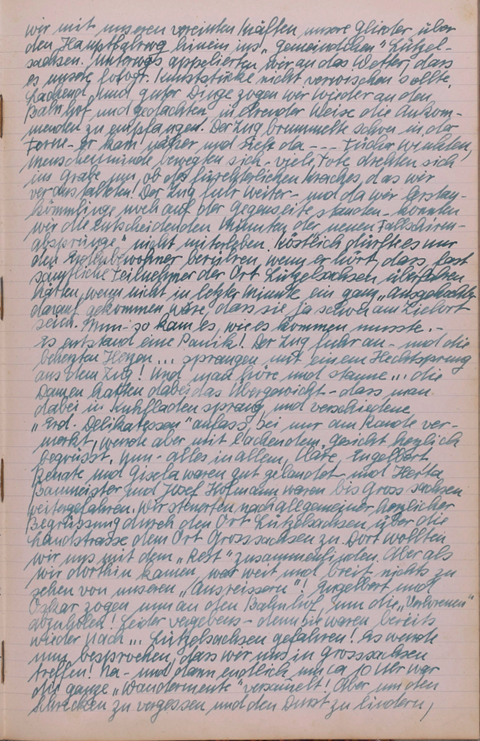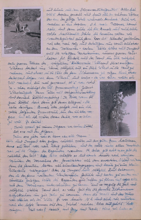 windig, dementsprechend benimmt sich unser Feuer, und die Suppe schmeckt vom Ruß besonders gut. Kartoffeln haben wir gesammelt und wollen sie in der Asche rösten. Aber niemand hat Appetit darauf, nur die Falläpfel sind ein willkommener Nachtisch. Zum Essen wird es uns auf freier Höhe zu kalt, wir verziehen uns an den Waldrand, inmitten Ginster und Brombeerbüschen. Es schmeckt allen gut, trotz Ruß und Dreck, aber unser Topf wird nicht leer. Klaus hütet inzwischen das Feuer. Unsere Teller und Töpfe müssen wir dreckig mit ins Dorf nehmen, um sie dort auf einem Bauernhof unter der Viehtränke zu reinigen, der Hofhund bekommt von Seppel den Rest ins Futternapf.