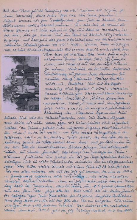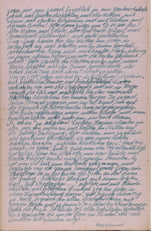Täler u. Höhen an uns vorüberziehen und voll ehrlicher, reiner Freude gaben wir uns ganz diesem Abschiedsdebut der Natur hin! Da unsere inneren Organe aber noch nach flüssigen Stoffen verlangten, kehrten wir unterwegs noch einmal in eine Gastwirtschaft ein, tranken, aßen, lachten und scherzten, beglichen unsere Schulden und schrieben an unseren neuen Präsidenten und den neuen Wanderführer Ansichtskarten mit großem Inhalt. Aber dann ging es endgültig, nachdem wir noch Bilder verknipst hatten, den heimatlichen Gefilden entgegen, untermalt von „lieblichem Chorgesang“ unseres lieben kleinen Bernhard, der gern auf der „Wutz“ herumgeritten wäre. Und mit Kochtopfgeklapper und erlebnisreichen Stunden kehrten wir mit den letzten Sonnenstrahlen in leiser Wehmut in das liebe, traute Heppenheim zurück und dankten mit frohen Herzen unserem Herrn und Schöpfer für diese schönen fröhlichen Stunden des verflossenen Wandertages! Unser Innerstes, aber war in heiligste Freude getaucht und suchte in edlen Worten den Ausdruck des Dankes zu finden, der Jenem gebührt, der so allmächtig und Allweise die Geschicke der Menschheit lenkt und in lieber Vertrautheit den Menschen Liebe, Freude und Güte spendet und uns lehret, soweit es Menschen möglich ist ihm gleichzutun! In uns und mit uns sang ein herrlicher Chor, das schöne Lied: