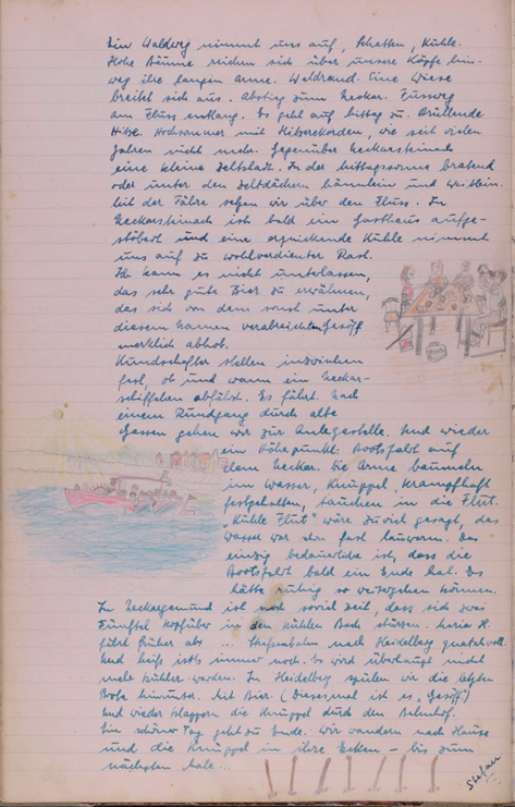 Hier bewunderte man wieder den alten Bau, suchte im Gedächtnis etwas über die Geschichte des Schloßes nach u. entschloss sich endlich, sich einer Besichtigung anzuschließen. Ein Stücklein altes Deutschland, alte Heimat, wurde aus seiner Vergangenheit geholt. So verließ man auch diese Stätte, nachdem man nochmals die Sonne auf sich ruhen ließ, nachdem man einen letzten Blick auf das am Neckar liegende Heidelberg warf. Man wollte sich nun den Kaffeehunger stillen,.Doch oh Jammer, fast alle Hotels von Amis beschlagnamt, das eine Café, welches auf war, überfüllt u. die restlichen Gaststätten öffneten erst ab ½ 6 Uhr. Man ging wieder in die untere Neckarstraße 8. Wie schnell verfloss auch diese Zeit und man eilte zur Bahn. Husch - husch ging es in das schöne Heppenheim zurück. Maria verließ in Weinheim die frohe Garde mit der Versicherung bald wieder in diesen Reihen zu sein und verfolgte die Bande noch bis nach Hause, (mit ihren Gedanken!) In Heppenheim begrüßte diese einen tüchtigen Regenschauer, doch man war ja von der Mörlenbachtour schon Wassergeprüft und für was hat man Kavaliere? Engelbert u. Josef eilten, um die Schirme zu holen doch bis sie kamen war man schon im Häuschen Hammerruh!