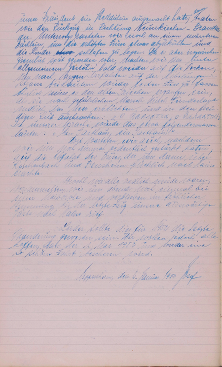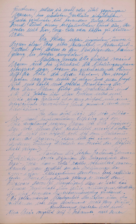 Von Kallstadt aus kamen wir wieder auf die Chaussee nach Niederliebersbach. Hier suchten wir wieder eine Wirtschaft auf, denn es war inzwischen Kaffeezeit geworden. Nach kurzem Marsch auf der Landstraße kamen wir an eine Anhöhe, die wir schnaufend erstiegen. Unser armer Burkhard war vor lauter Eifer in eine Pfütze getreten und hatte seinen schönen weiße Hose von oben bis unten beschmutzt. Was ihm eine gehörige Tracht Prügel von seinem Herr Papa eintrug. Wie wir nach Hause kamen weiß ich heute nicht mehr.