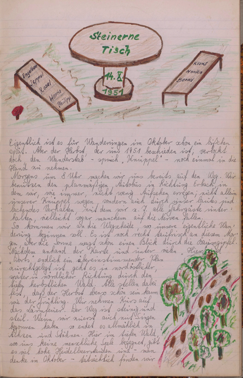 Angela Di Turi, Mitglied des Heppenheimer Geschichtsvereins hat es auf dem Flohmarkt entdeckt: ein Büchlein mit handschriftlichen Einträgen, betitelt: „Knüppelgarde“. Dabei handelt es sich um ein Wandertagebuch einer Gruppe junger Menschen aus Heppenheim und Nachbarorten. Zwischen 1946 und 1953 machte diese „Knüppelgarde“ zahlreiche Ausflüge in die Umgebung Heppenheims, die sie schriftlich dokumentierte und bebilderte. Diese interessante Quelle soll hiermit der Öffentlichkeit zugänglich gemacht werden. Herr R. Hillenbrand, der Sohn des ehemaligen Eigentümers Engelbert Hillenbrand, hat der digitalen Veröffentlichung auf der Internetseite des Heppenheimer Geschichtsvereins zugestimmt, wofür wir ihm herzlich danken. Der Text wurde von Angela Di Turi sorgfältig und zeichengetreu transkribiert und von Karl Härter korrigiert. Zur seitenweisen dargestellten Transkription (links) kommen die Originalseiten mit den Zeichnungen (rechts). Ausgelassen wurden lediglich Textteile und Seiten, auf denen sich personenbezogene Informationen finden. Sollte sich dennoch einer der im Text genannten Personen in seinen Rechten verletzt sehen, kann er den Geschichtsverein kontaktieren, der die entsprechenden Passagen gegebenenfalls herausnehmen wird. Der Heppenheimer Geschichtsverein wünscht allen Leserinnen und Lesern viel Vergnügen beim Eintauchen in die Erlebnisse der Knüppelgarde rund um Heppenheim.