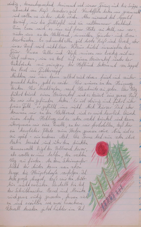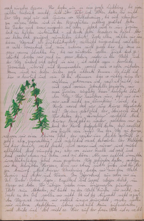 noch einzelne Beeren. Wir treten nun in eine große Lichtung, die einen wilden Eindruck macht; Sicht über Täler und Höhen haben wir nicht. Der Weg zeigt nur viele Spuren von Wildschweinen, die sich scheinbar am nassen Boden und in den Regenpfützen entlangewälzt haben. Die Viecher sind zwar nirgends zu sehen, jedoch wird uns Frauen doch ein bisschen unheimlich – ich denke dabei besonders an Resel. Aber wir haben doch genügend männlichen Schutz! Trotz allem wählen wir uns diesen Wegrand als Frühstücksplatz; vielleicht ausgerechnet, weil alles so wild-romantisch ist, zum anderen wirft gerade hier die Sonne ein paar warme Strahlen hin, die wir auskosten wollen. Frisch und gestärkt treten wir nach ein paar Metern wieder in den Wald und der Weg ändert sich sofort in eine – ich möchte sagen – herrliche Promenade, übersät mit Tannennadeln, worauf man so schön rutschen kann und zu beiden Seiten große schlanke Tannen. Die Luft ist hier so herrlich und rein. Ob den Männern dies so richtig zum Bewusstsein gekommen ist, weiß ich nicht; sie sind weit voraus. Jedenfalls genießen wir zwei Frauen ausgiebig, dieses herrliche Stückchen weg. – Wir wundern uns, dass wir immer noch nicht am „Lärmfeuer“ sind; die Karte weist doch nur eine kurze Wegstrecke auf! Vor uns plötzlich der „Steinerne Tisch“: Wir haben das „Lärmfeuer“ verfehlt. Nach kurzer Rast geht es weiter, nachdem wir anhand der Karte festgestellt haben, dass westlich eine Quelle sein muss. Um den Weg zu kürzen, nehmen wir einen kleinen Pfad, der später ins Nichts verläuft. So geht’s also „querwaldein“ und möglichst rasch talwärts. Der Waldboden ist hier bereits recht feucht, wird nasser und nässer und mutet schließlich fast sumpfig an; aber von einer Quelle ist weit und breit weder etwas zu sehen noch zu hören. Als wir endlich inmitten urwaldähnlichen Gebiets einen gangbaren Weg gefunden haben, verfolgen wir den betrübten Herzens, denn wir ahnen nichts Gutes und der Magen knurrt. Nach kurzer Wanderung treten wir aus dem Wald heraus auf Äcker und Wiesen. Vom Jägerstand aus sehen wir im Tal Unter-Ostern liegen. Engelbert und Seppl steigen talab, um Wasser zu holen. Wir Übrigen suchen einen einigermaßen günstigen Platz zum Abkochen; zu dicht an den Wald dürfen wir nicht, zu nahe an den Ort wollen wir nicht. Da ist die Auswahl nicht so groß. Am Wegrand machen wir endlich unsere Feuerstatt, rasten wollen wir unterm Apfelbaum. Steine sind auch kaum aufzutreiben, mit Mühe und Not reicht es. Hier auf der freien Höhe ist es recht