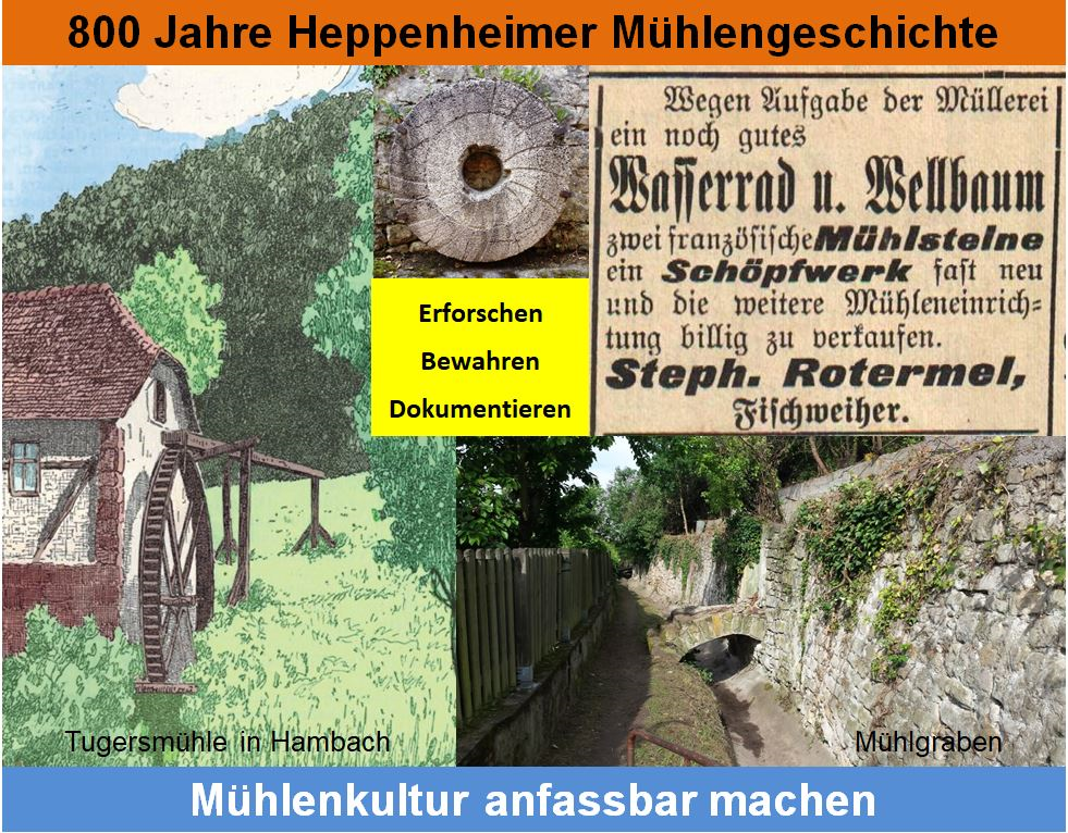 Zusammen mit den Heppenheimer Altstadtfreunden und der Stadtverwaltung hat der Geschichtsverein den „Heppenheimer Mühlenrundweg" 2014 eingerichtet und 2016 bis nach Kirschhausen erweitert und abgerundet. Ziel ist es, die Erinnerung an die Mühlenzeit, als Heppenheim mit über 80 Mühlenstandorten eine Stadt der Mühlen war, zu bewahren und die Relikte aus 800 Jahren Mühlenindustrie und Mühlengeschichte zu erhalten und der Öffentlichkeit zugänglich zu machen.
