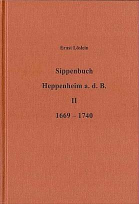 |  Inhaltsverzeichnis und Vorwort (pdf-Datei) Register (pdf-Datei) Änderungen (pdf-Datei) | Sippenbuch Heppenheim a.d.B. II, 1669 – 1740, Ernst Löslein, Deutsche Ortssippenbücher Reihe B Band 24, Heppenheim a.d.B., 1984 2., überarbeitete und ergänzte Auflage, herausgegeben von Hans Joachim Büge im Auftrag des Heppenheimer Geschichtsvereins, Heppenheim a.d.B., 2014 Ergänzungen und Korrekturen an: Manfred Bräuer, Lisztweg 6, 64646 Heppenheim Bestellungen bei: Manfred Bräuer, Lisztweg 6, 64646 Heppenheim Preis 28,00 € zuzüglich Versandkosten |