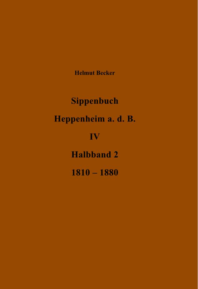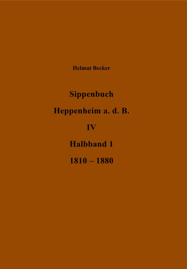 |   2 Teilbände Inhaltsverzeichnis und Vorwort (pdf-Datei) Register (pdf-Datei) Korrekturen und Ergänzungen 02/23 (pdf-Datei) Vorwort Sippenbuch IV | Sippenbuch Heppenheim a.d.B. IV 1810 – 1880, Helmut Becker, Deutsches Ortssippenbuch Nummer 02.048, herausgegeben von Hans Joachim Büge im Auftrag des Heppenheimer Geschichtsvereins, Heppenheim a.d.B., 2017 (zwei Halbbände mit zusammen 1346 Seiten) Ergänzungen und Korrekturen an: Hans Joachim Büge, Von-Kleist-Str. 9, 64646 Heppenheim
